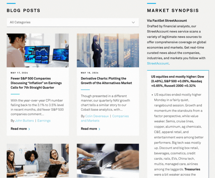 FactSet’s insights cover a breadth of topics. Most notably, their Market Synopsis” section (right) offers real-time coverage of the latest in global economies and markets.